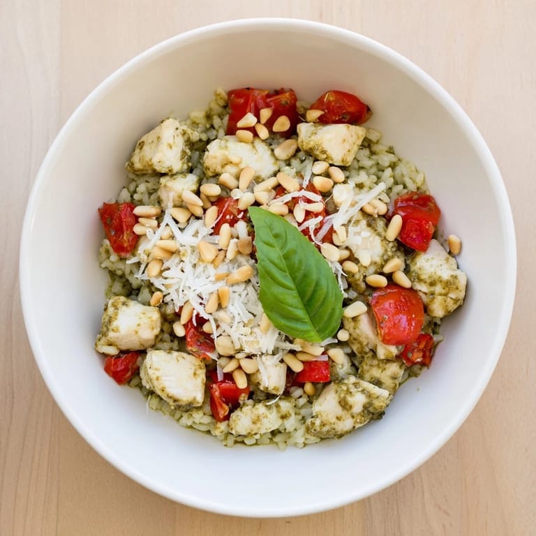 Save The smell of basil always takes me straight back to summer evenings when dinner needed to be quick but still feel like a treat. I had a jar of pesto in the fridge, leftover rice from the night before, and chicken that needed using. What started as a throw-it-together meal turned into something my family asks for by name. It's the kind of bowl that feels both nourishing and indulgent without any fuss.