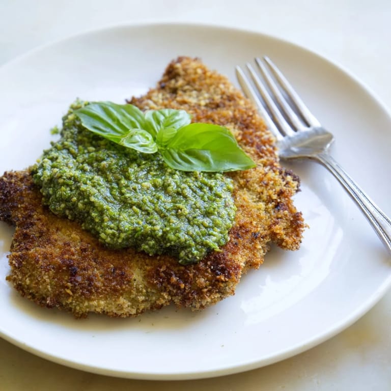 Save The sizzle hit first, that sharp crackle when breaded chicken meets hot oil. I was racing the clock on a Wednesday, juggling a work call and a hungry family, when I realized this dish doesn't need fuss to feel special. The golden crust puffed up fast, and that bright green pesto I dolloped on top made it look like I'd planned something fancy all along. Nobody asked why dinner was ready in half an hour, they just kept reaching for seconds.