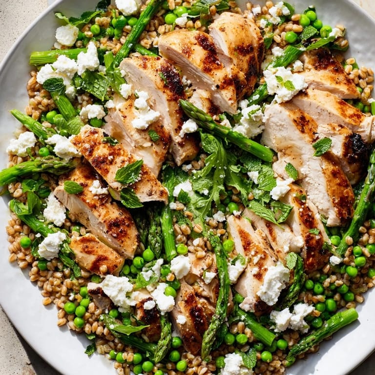 - Combine the cooked farro, sliced chicken, blanched asparagus, peas, and arugula in a large bowl. Drizzle with the vinaigrette and toss gently until everything is evenly coated.